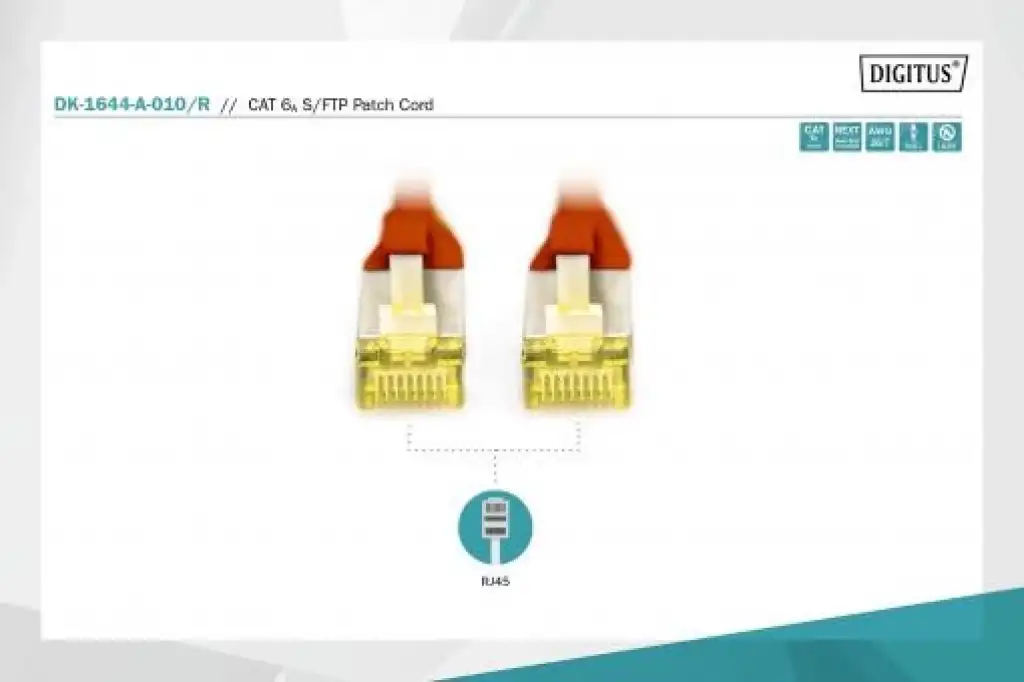 DIGITUS® Kategori 6A Sınıf EA patch kablolar ISO/IEC 11801 ve DIN EN 50173 CAT 6A standardına göre üretilmiş ve test edilmiştir. Kablo kurulumunun ISO ve EN Kanal spesifikasyonuna uygunluğunu garanti ederler ve DIGITUS® CAT 6A kablolamada mükemmel performans sunarlar. Performans, yakın uç karışma ("NEXT") gibi performans özellikleri de dahil olmak üzere 500 MHz'e kadar test edilmiştir. DIGITUS® patch kabloları, çeşitli uygulama alanlarındaki tüm gereksinimleri tam olarak karşılamak için özel olarak geliştirilmiştir. Her kablo, gerilim azaltma özelliğine sahip kalıplanmış bir bükülme önleyici gromet ile donatılmıştır. Grommet ayrıca kablonun sıkışmasını ve mandallama kolunun fişten kopmasını önleyen bir mandallama kolu korumasına sahiptir. Fişlerin sarı rengi, kategori 6A'yı tanımlamayı kolaylaştırır.