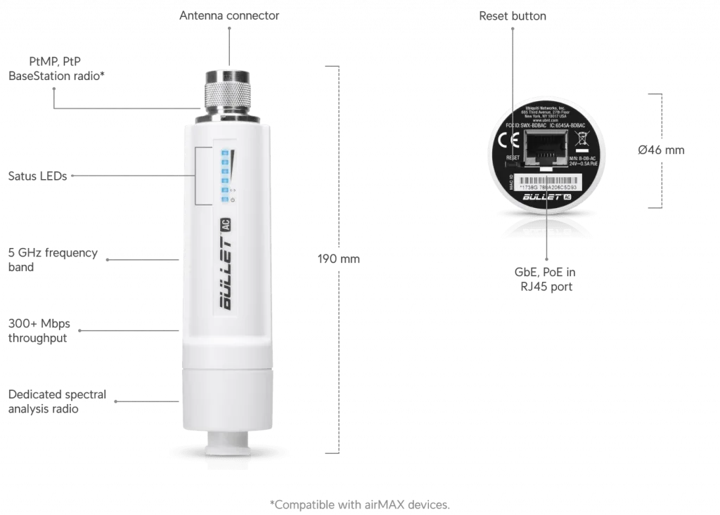 Bullet AC, N-tipi konnektöre sahip herhangi bir antenle kullanılabilir. Projenize göre aşağıdaki Ubiquiti antenlerini veya diğer uygun antenleri tercih edebilirsiniz.
