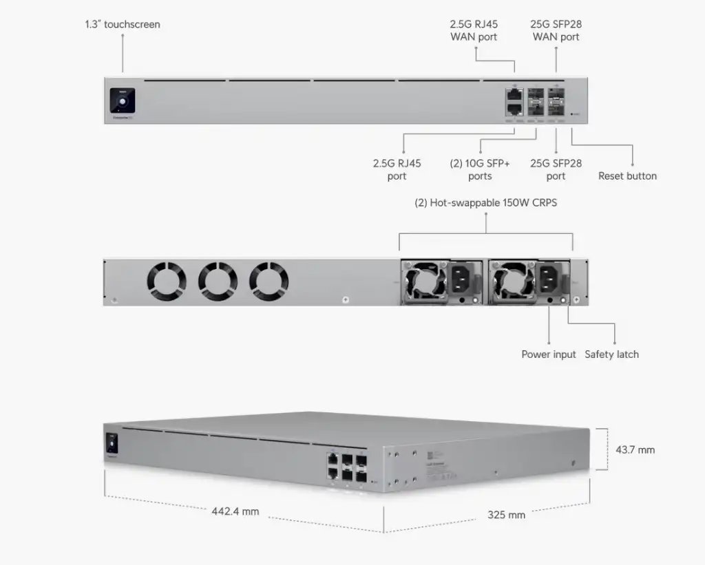 (2) 25G SFP28**, (2) 10G SFP+**, and (2) 2.5 GbE RJ45 ports (two interfaces remappable to WAN)
