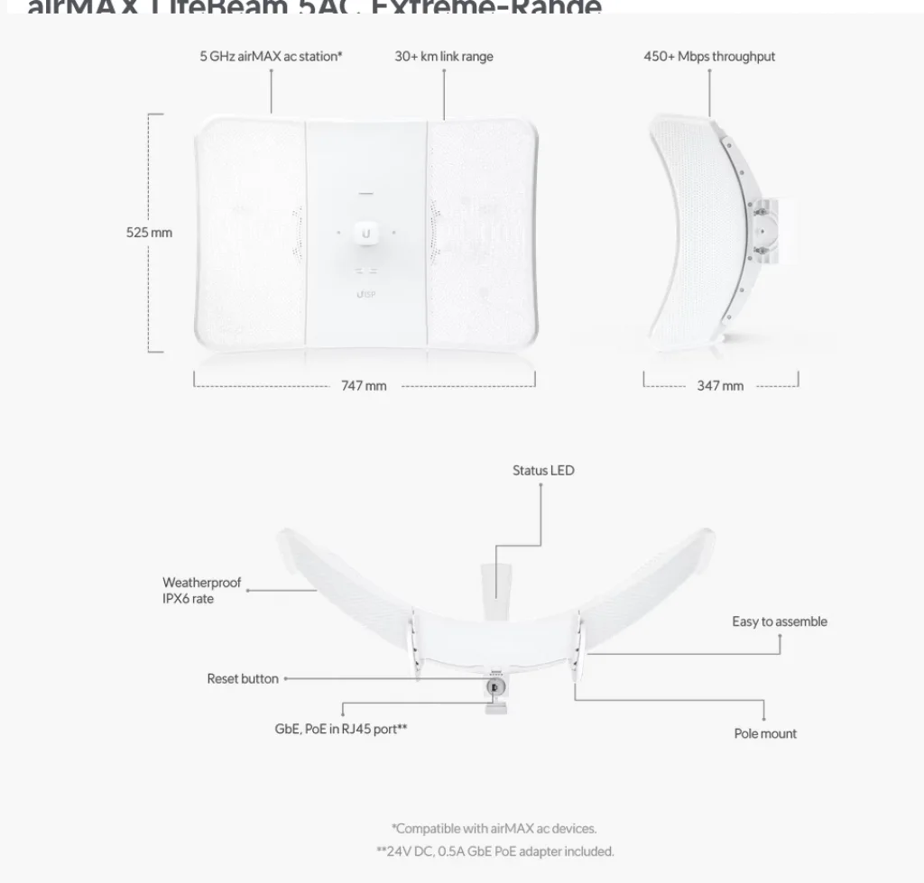 Ubiquiti LBE 5AC XR Extra Uzun Menzil 5 Ghz 30Km PtMP, PtP Outdoor Access Point