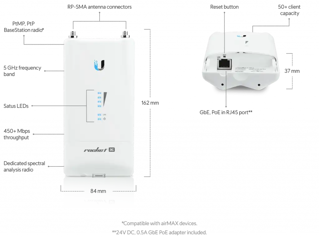 Ubiquiti UBNT R5AC-Lite Rocket AC 5GHz Carrier Class airMax BaseStation 450Mbps+ 27dBm Access Point Özellikleri