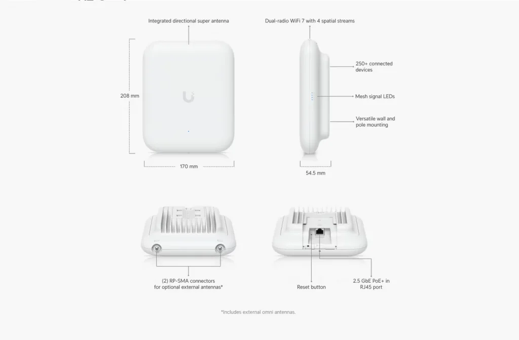 465 m² (5,000 ft²) Entegre yönlü süper anten ile açık alan kapsama alanı