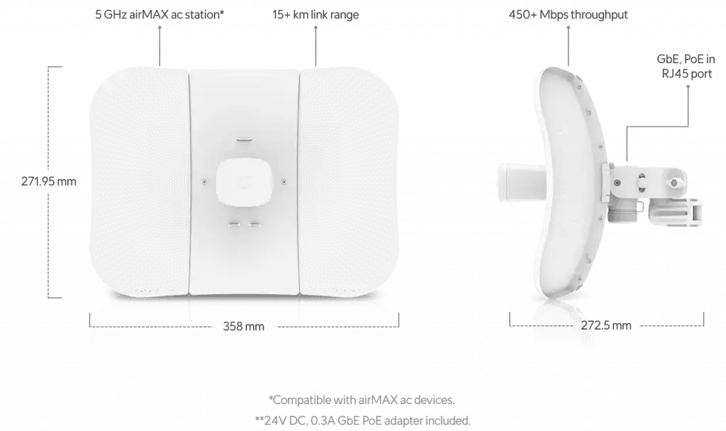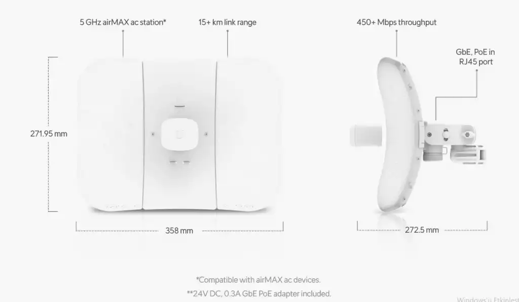 Uzun mesafeli kablosuz bağlantılarınızı güçlendirin. 5 GHz AC standardında, entegre antenli ve patentli airMAX AC teknolojili dış mekan CPE. PtP ve PtMP ağlarda yüksek bant genişliği ve güvenilirlik sunar.