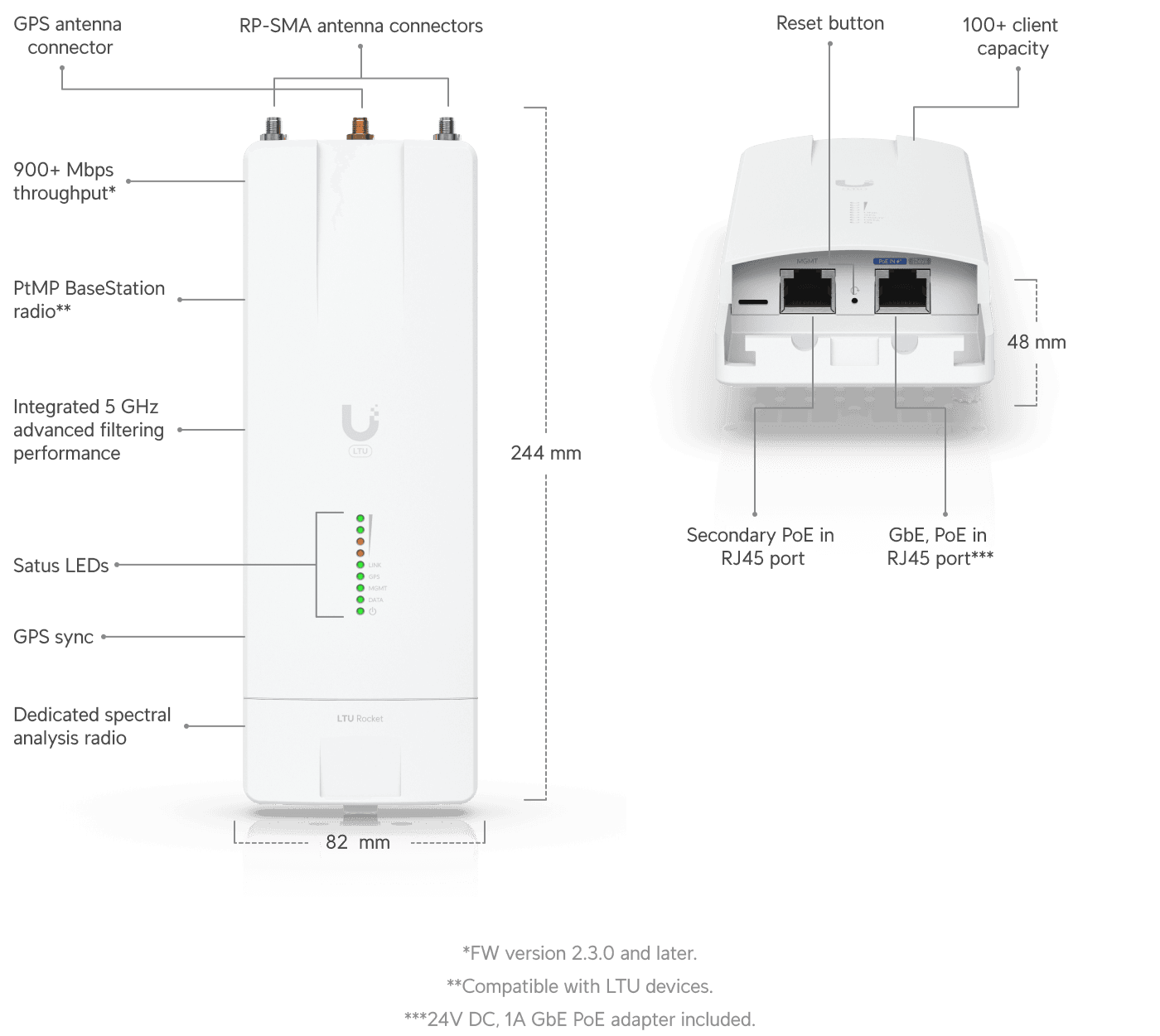 Ubiquiti’nin tescilli LTU teknolojisini kullanan LTU-Roket, üstün performans için 2+ Mpps işleme, özel RF filtreleme ve esnek GPS senkronizasyonuna sahip bir Noktadan Çoklu Noktaya (PtMP) 5 GHz Erişim Noktasıdır. Kanal genişliği esnekliği (10/20/30/40/50 MHz),yerel paraziti önlemek için radyo bandının herhangi bir yerinde bağımsız TX ve RX kanal frekans konfigürasyonlarına izin verir.