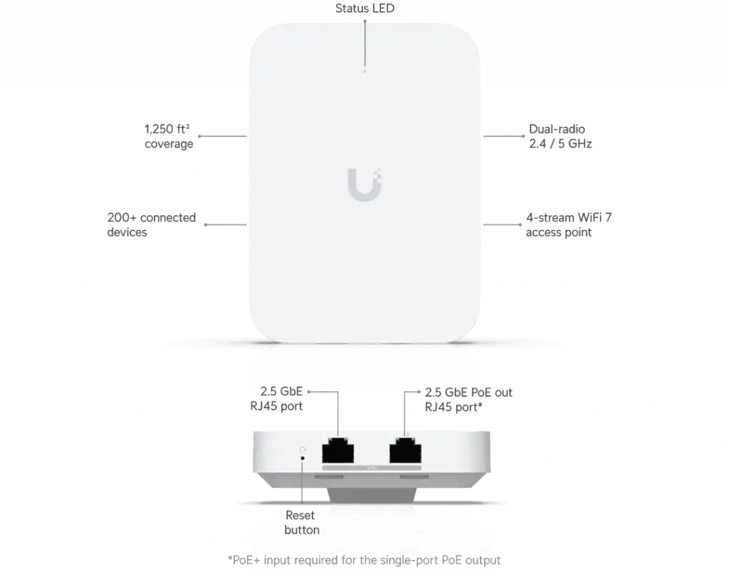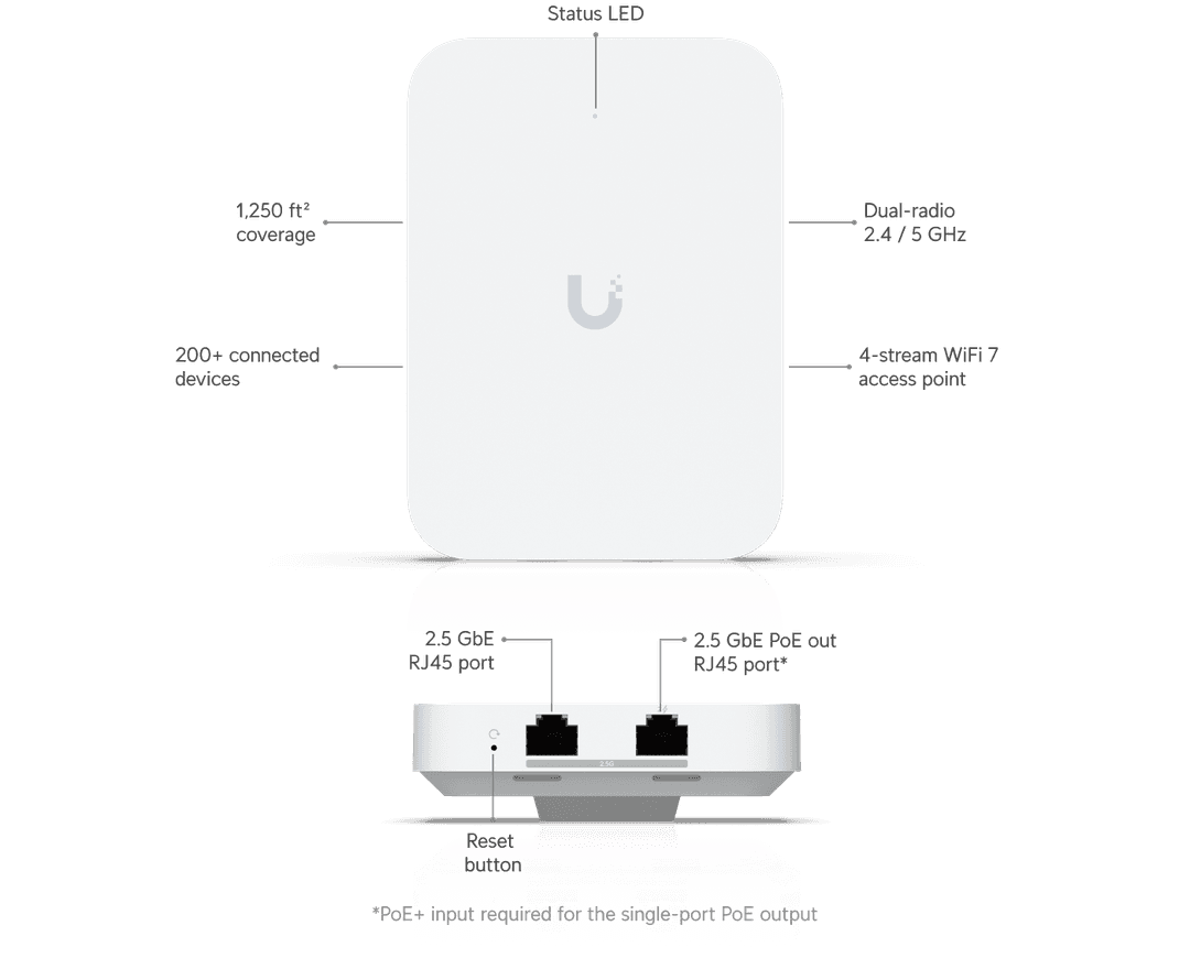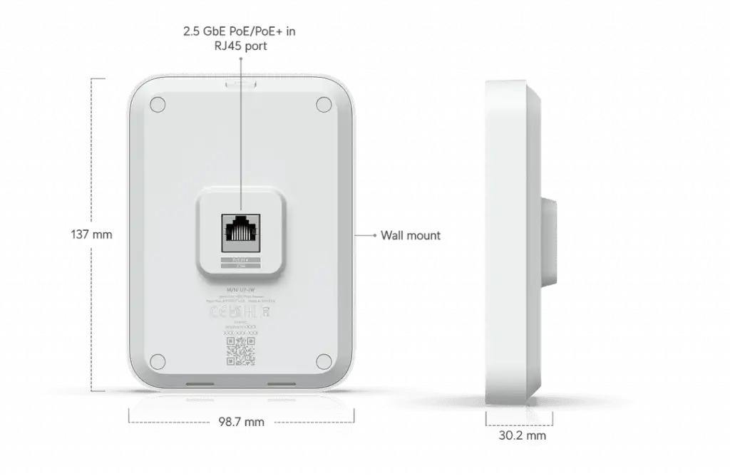 U7 In-Wall , özellikle oteller, yurtlar ve modern ofisler için tasarlanmıştır. Standart bir Ethernet duvar prizinin yerine monte edilir. Odaya hem en yeni teknoloji olan WiFi 7 ile kablosuz bağlantı sunar hem de dahili 2 portlu switch'i sayesinde TV, çalışma masası veya PoE destekli bir telefon gibi kablolu cihazlar için düzenli bir bağlantı noktası oluşturur.