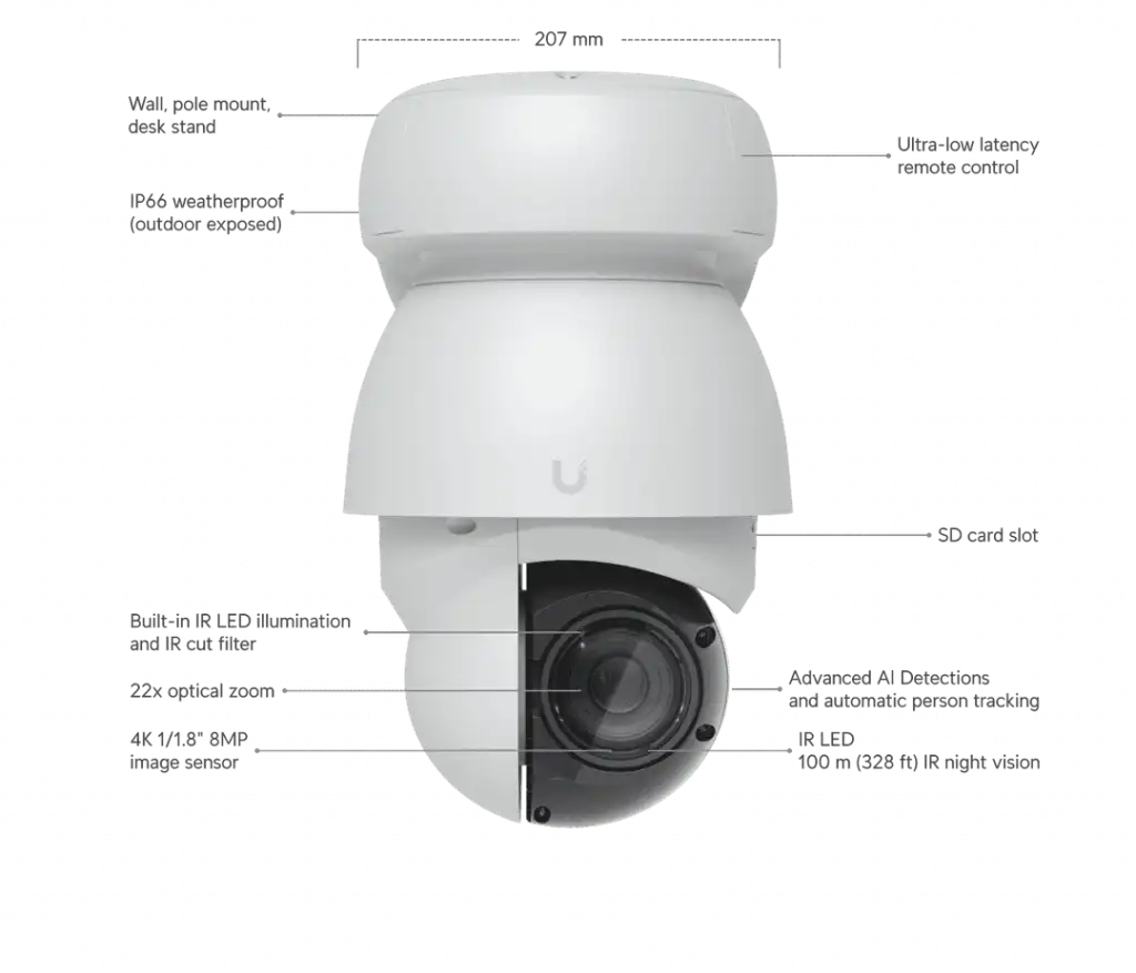Dayanıklı dış yapısı, IP66 hava koşullarına dayanıklılık derecesiyle en zorlu dış mekan koşullarında bile sorunsuz çalışmasını sağlar. Geniş görüş alanı ve güçlü zoom kapasitesi, tek bir kamera ile büyük bir alanı kapsamanıza olanak tanır, bu da kurulum maliyetlerini düşürür ve yönetim kolaylığı sağlar. UniFi Protect ekosistemine sorunsuz entegrasyonu sayesinde tüm kayıtlarınıza kolayca erişebilir, mobil uygulama üzerinden kamerayı uzaktan kontrol edebilir ve canlı izleme yapabilirsiniz.