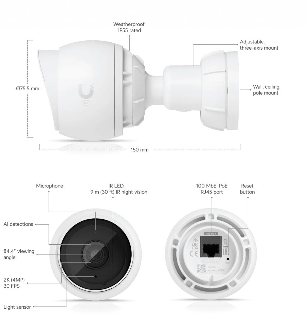 UVC-G5-Bullet, hem evinizin içinde hem de dış kapınızın önünde, bahçenizde veya garajınızda güvenle kullanılabilir. IPX4 derecesi sayesinde hafif yağmura ve sıçramalara karşı dayanıklıdır. Gelişmiş yapay zeka destekli hareket algılama ve gece görüşü özellikleri ile şüpheli durumları anında tespit eder ve UniFi Protect NVR'ınıza kaydeder. Kolay montajı ve esnek konumlandırma seçenekleri ile her yere uyum sağlar.
