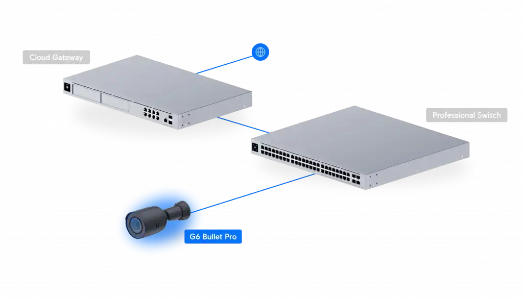 Sistem odanızdaki NVR ve Switch ile tek bir ağ kablosu (PoE+) üzerinden güç alarak saat gibi çalışır.