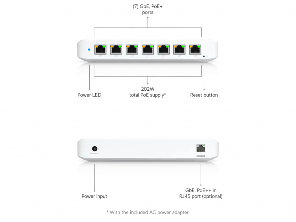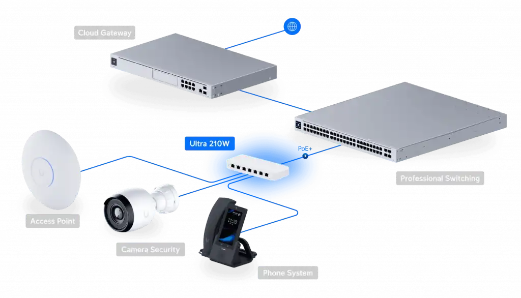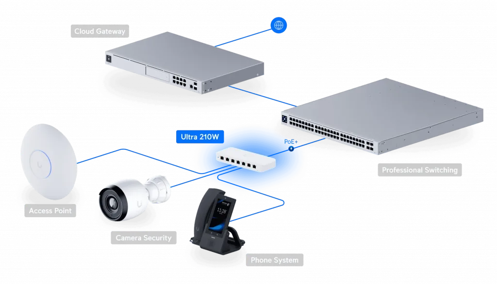 USW-Ultra-210W, bir mağaza, restoran veya ofis katındaki tüm cihazları beslemek için idealdir. Kasa arkasına veya bir dolap içine kolayca monte edilir. 202W'lık devasa güç bütçesi, birden çok yüksek performanslı WiFi 6/7 Access Point'i, çok sayıda güvenlik kamerasını ve VoIP telefonları aynı anda sorunsuzca çalıştırır.