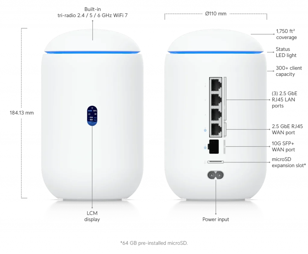 Entegre WiFi 7, PoE anahtarı, microSD depolama ve tam UniFi uygulama desteğine sahip masaüstü 10G Cloud Gateway Router Firewall