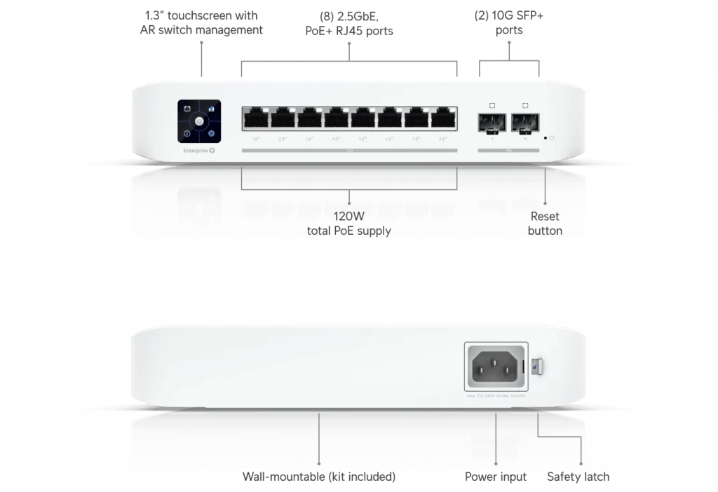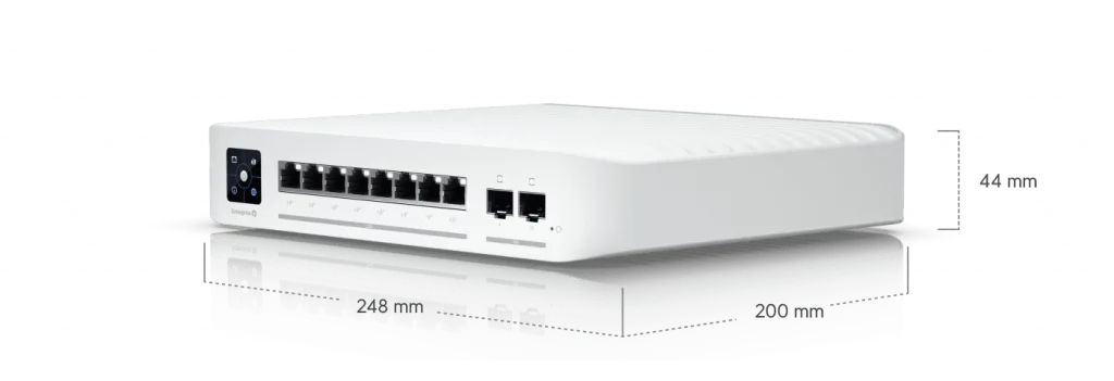 The Switch Enterprise 8 PoE (USW Enterprise 8 PoE) is a fully managed, Layer 3* switch with (8) 2.5GbE, 802.3at PoE+ RJ45 ports and (2) 10G SFP+ ports.The USW Enterprise 8 PoE also features a 1.3" LCM color touchscreen that concisely displays key system and connection insights. This switch can be monitored or configured from anywhere with the powerful, intuitive UniFi Network web application and mobile app.