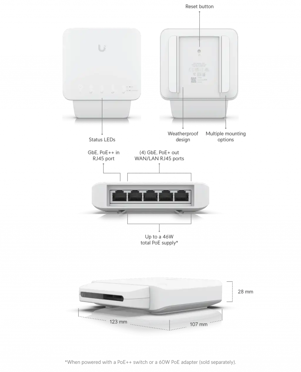 USW-Flex , 60W 802.3bt PoE ++ güç kaynağı ile maksimum 46W PoE çıkış gücünü destekler. Ağdaki