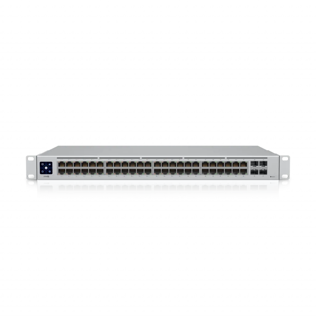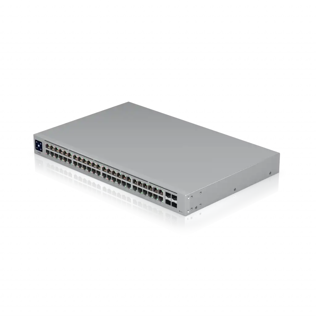 USW-48-PoE (UniFi anahtarı GEN2),RJ45 Ethernet cihazlarına ve Gigabit fiber uplink'e Gigabit PoE bağlantıları sağlayan 32 802.3at PoE + otomatik keşif ve 4 SFP bağlantı noktası dahil olmak üzere 48 Gigabit Ethernet bağlantı noktasına sahip yapılandırılabilir bir Gigabit Katman 2 anahtarıdır