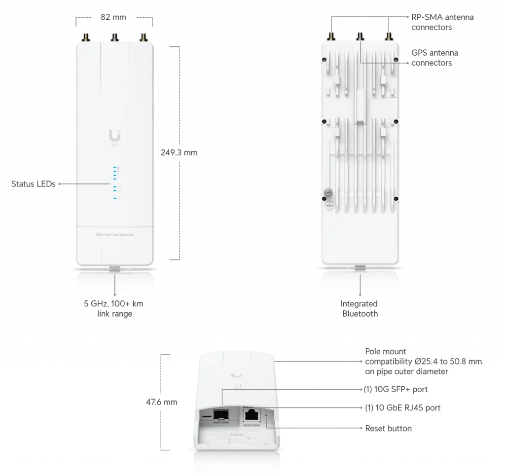 WiFi 7 tabanlı, çift 5 GHz radyo sunar ve Multi-Link Operation (MLO) teknolojisi ile geliştirilmiş performans sağlar. 5+ Gbps'ye varan yüksek veri aktarım hızı, 100+ km'ye varan menzil ve 10 GbE bağlantı noktası gibi özelliklere sahiptir. Ayrıca, dayanıklı alüminyum alaşımlı ve UV'ye dayanıklı polikarbonat bir gövdeye ve çelik askı veya evrensel bir braket ile monte etme olanağına sahiptir. Uzun Menzilli PTP Noktadan Noktaya Link aktarımlarınız da WiFi 7 Teknoloji sunmaktadır.